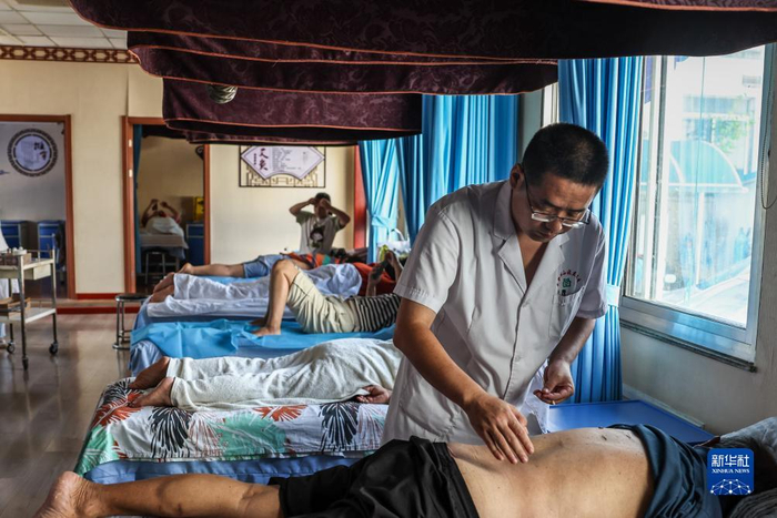9月2日,在文登环山社区卫生服务中心,医生王永刚为患者进行中医诊疗。近年来,山东省威海市文登区以国家中医药综合改革试验区建设为契机,在全区范围内推广“基层巡诊+中医药服务”模式,设立中药配送中心,全链条保障中药饮片质量安全。目前,文登区有包括1所三级甲等中医院在内的230多处中医药服务机构、164个中医药参与的家庭医生服务团队,建立起覆盖区镇村三级的中医药服务体系。新华社记者 朱峥 摄