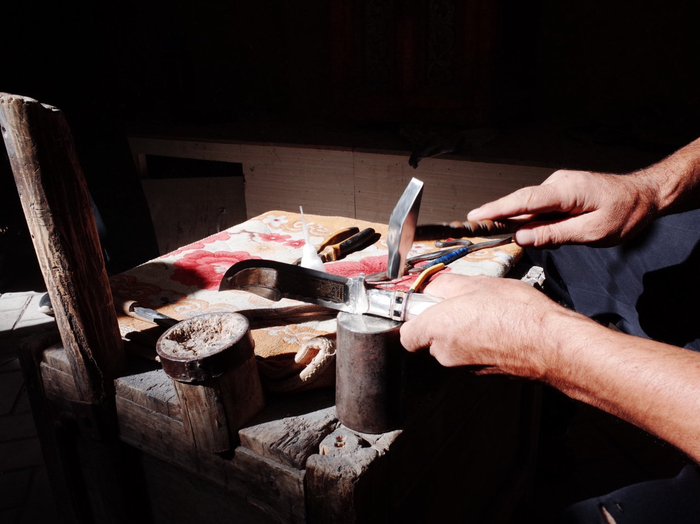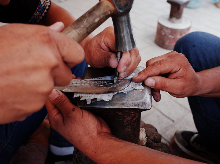 英吉沙小刀做工精细、造型美观,对制作流程中各环节的要求颇高,锻打、接合、淬火、回火等方面均需达到炉火纯青的地步。具体流程为:选材——煅烧——捶打——接合——二次锻打——淬火——打磨——锉平——装饰刀身、刀柄——完型。