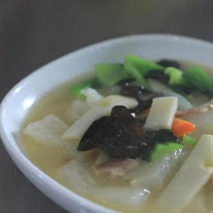 干蹄筋、杏鲍菇(可用其他菌类替换)、腊肉、青菜、胡萝卜、猪油、小葱、盐、糖、味精、鸡汁