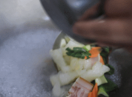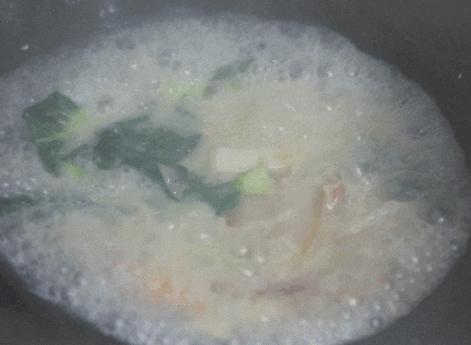 煮开后,加入适量盐和糖,用勺子继续来回翻动。