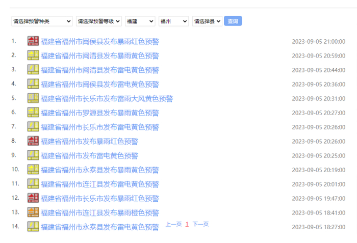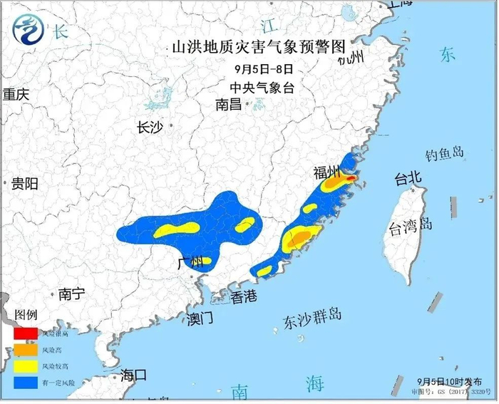 5日20时至6日20时福州的闽侯县、连江县、罗源县、永泰县,莆田的仙游县,泉州的永春县、德化县、南安市,漳州的龙海区、漳浦县、诏安县,宁德的蕉城区、霞浦县、福安市地质灾害气象风险预警为橙色预警,地质灾害发生可能性大,应做好值班值守、监测、巡查和防范,应按有关规定及时组织危险性较大的地灾隐患点和危险区域内的群众转移,确保人民生命安全。