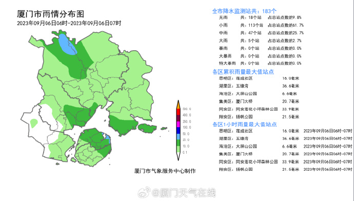 @厦门天气在线:预计未来2小时(6:00~8:00)翔安区、同安区、思明区、湖里区全区累计雨量可达30~60毫米,集美区、海沧区全区累计雨量可达30~40毫米。上学、上班路上请注意安全!