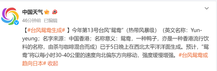 今年第13号台风“鸳鸯”(热带风暴级)(英文名称:Yun-yeung;名字来源:中国香港;名称意义:鸳鸯,一种鸭子,亦是一种香港流行饮料的名称,由茶与咖啡混合而成)已于5日晚上在西北太平洋洋面生成。预计,“鸳鸯”将以每小时30-40公里的速度向北偏东方向移动,强度缓慢增强。
