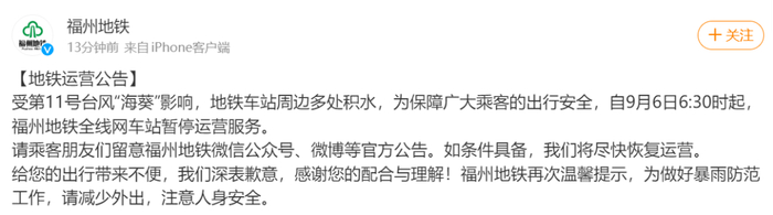 今日(6日)清晨,福州地铁宣布全线网车站暂停运营服务: