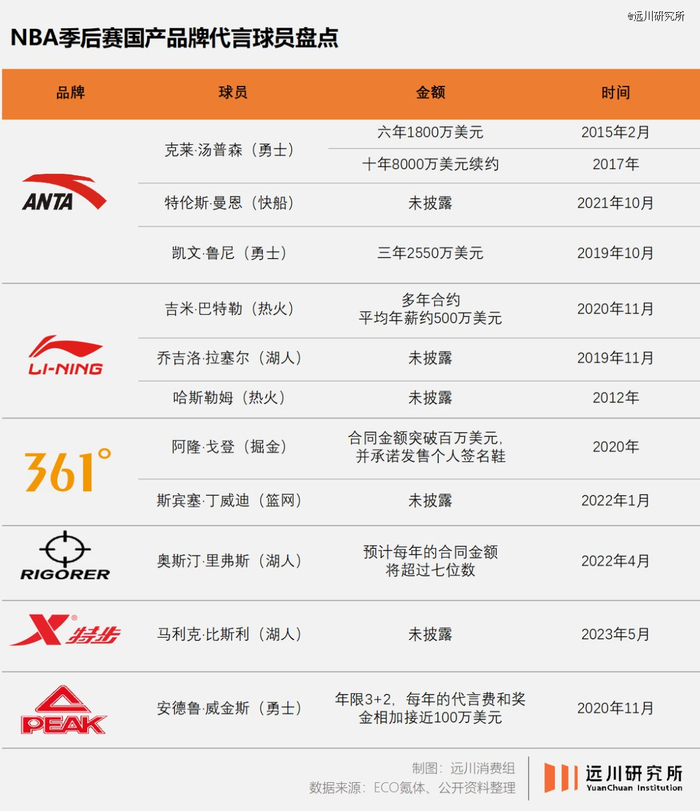 根据懒熊体育报道,2019年,李宁、安踏、Nike为签新秀球员威廉姆森争相报价,安踏报价接近1亿美元,李宁就报价10年2.5亿,最终威廉姆森还是被报价5年7500万的Nike拿下了。而此前Nike球鞋合同的年均价位往往在700万到1000万美元之间。