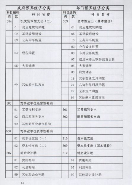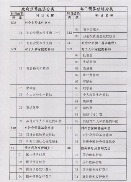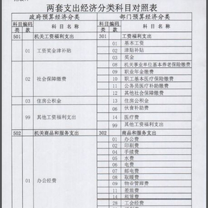 部门预算支出经济分类沿用现有的科目编码,如301类工资福利支出、302类商品和服务支出;政府预算支出经济分类从501开始编码,如501类机关工资福利支出,502类机关商品和服务支出。