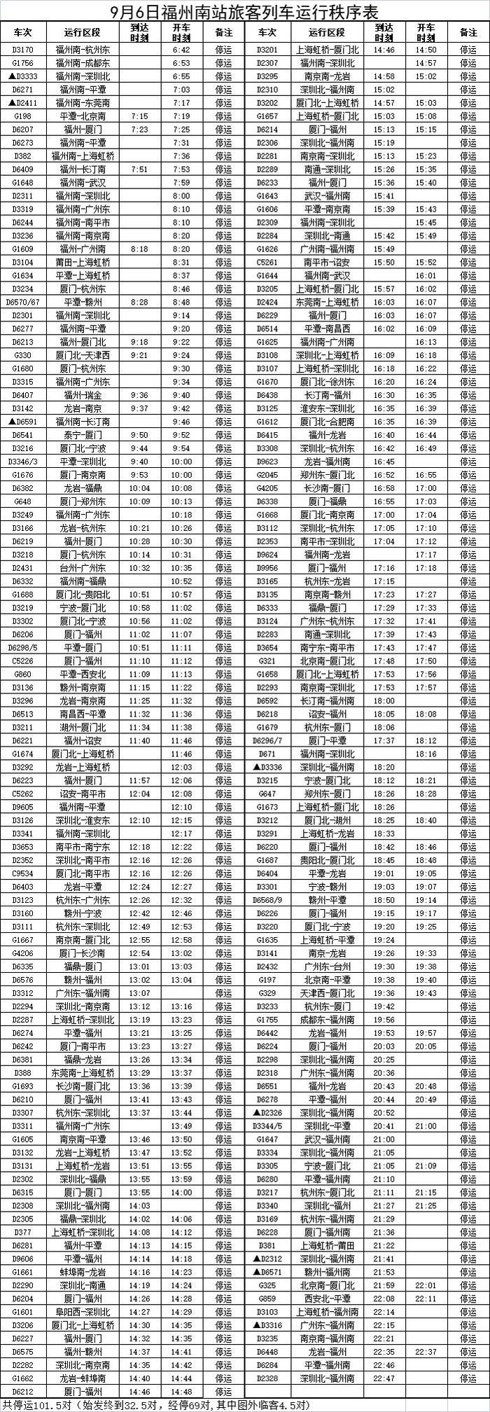 中央气象台9月6日06时继续发布暴雨黄色预警,预计至6日20时,福建东部和南部、广东东部、江西南部、浙江东南部等地部分地区有大到暴雨。为防范台风影响,确保旅客列车运输绝对安全,9月6日,福州火车站动态调整列车开行方案,其中福州站停运旅客列车118对,福州南站停运旅客列车101.5对。