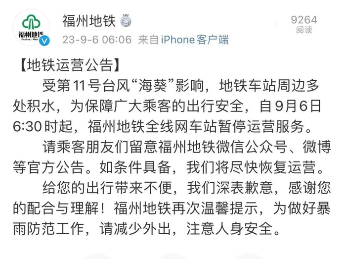 福州地铁6日发布公告,受第11号台风“海葵”影响,地铁车站周边多处积水,为保障广大乘客的出行安全,自9月6日6时30分起,福州地铁全线网车站暂停运营服务。