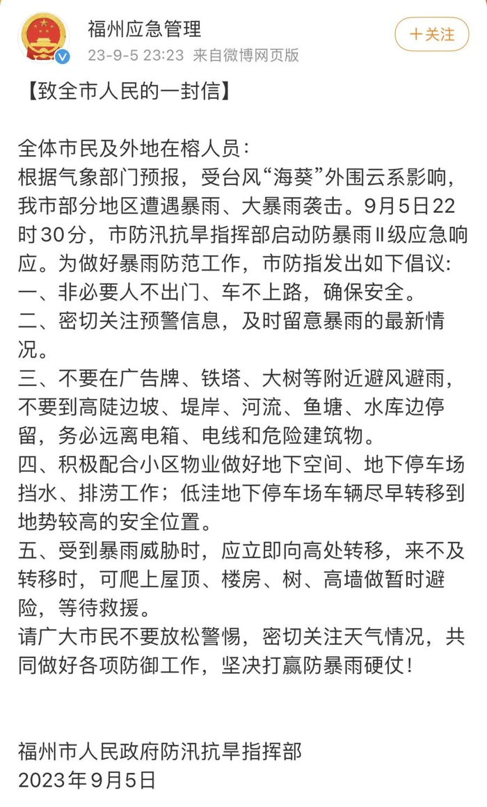 5日晚,福建省福州市应急管理局官方微博发布“致全市人民的一封信”,内容如下:
