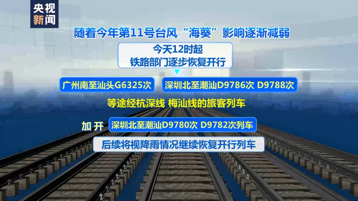 随着今年第11号台风“海葵”影响逐渐减弱,5日12时起,铁路部门逐步恢复开行广州南至汕头G6325次、深圳北至潮汕D9786次、D9788次等途经杭深线、梅汕线的旅客列车,加开深圳北至潮汕D9780次、D9782次列车。后续将视降雨情况,继续恢复开行列车。