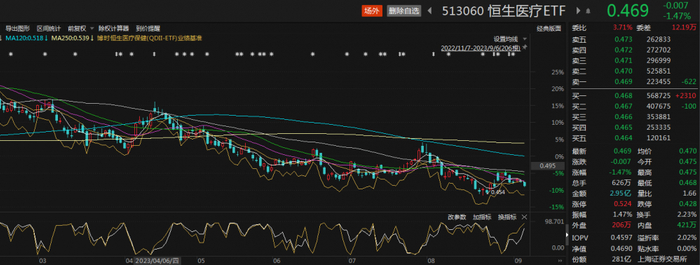 跟踪恒生医疗保健指数(HSHCI.HK)的博时恒生医疗ETF(513060)震荡弱势,盘中持续大幅溢价。截至发稿,该ETF跌1.47%,盘中溢折率超2%。