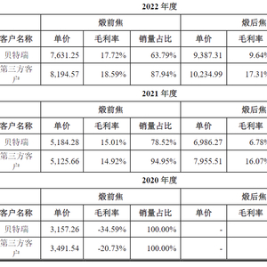 关于产品价格、毛利率与其他第三方的差异,益大新材主要归于产品差异。可是,对主营产品也是针状焦的京阳科技来说,益大新材将其列为可比企业的时候,选择的原因就是“产品中包含油系针状焦,与公司产品基本一致”;对其他第三方来说,虽然益大新材以负极焦分为段前焦和段后焦说明价格、毛利率存在差异,但同年度对贝特瑞销售的毛利率仍然低于第三方客户,说服力不强:
