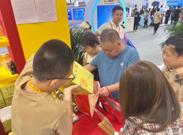 步入展厅,“嚯”,盖章打卡的前台早已人满为患。挤进去一瞧,原来盖章之余,大家都是被现场售卖的同仁堂枇杷露吸引。大家纷纷买上几瓶备着继续逛展,还有好多喝完觉得好,逛完服贸会专门折返回来整箱抱走的。同仁堂科技公司用枇杷制成的健康饮品,滋润了略显干燥的初秋,是整个展厅里名副其实的“香饽饽”。