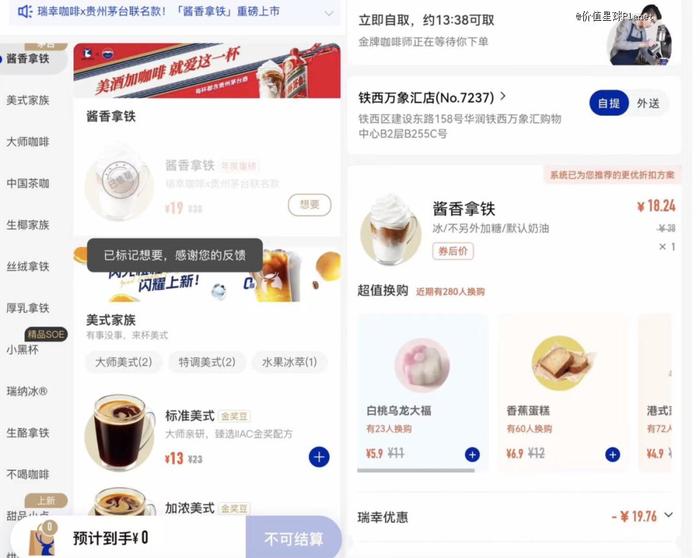 9月4日,瑞幸上线了和茅台联名推出的“酱香拿铁”。相比满街的“9.9元”咖啡,一杯酱香拿铁折后也要19.9元,作为新品折扣力度并不十分惊人。
