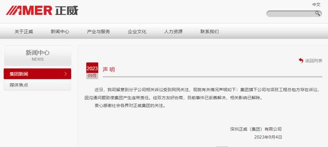 9月4日,正威集团官网发布声明称:“近日,我司留意到分子公司相关诉讼受到网民关注,现就有关情况声明如下:集团旗下公司与项目工程总包方存在诉讼,因沟通问题致使集团产生连带责任。经双方友好协商,目前事件已妥善解决,相关影响已解除。”
