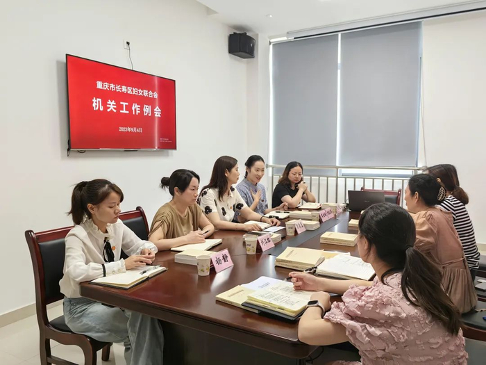 首轮轮值主席李佳妮(右二)参加区妇联每周一次的机关工作例会。