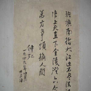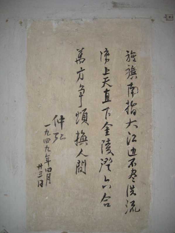 在渡江战役总前委旧址陈毅同志卧室的西墙壁上,题写着一首七绝诗。“旌旗南指大江边,不尽洪流涌上天。直下金陵澄六合,万方争颂换人间。”落款是“仲弘,一九四九年四月廿三日”。