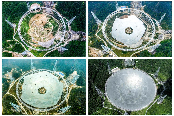 这是一张拼版照片:依次为“中国天眼”拼装第一块反射面板(左上,2015年8月摄)、“中国天眼”反射面板安装近半(右上,2015年12月摄)、“中国天眼”反射面板安装近八成(左下,2016年3月摄)、维护保养期间的“中国天眼”(右下,2022年7月摄)(无人机照片)。新华社记者 欧东衢 摄