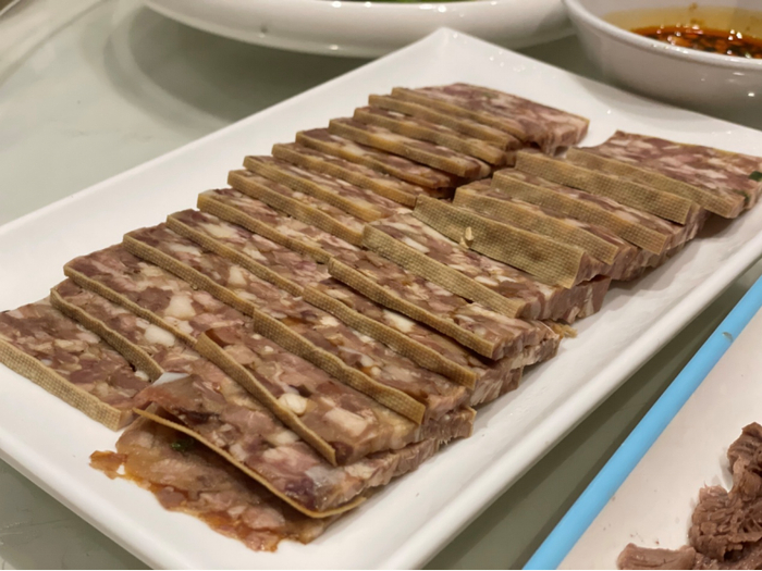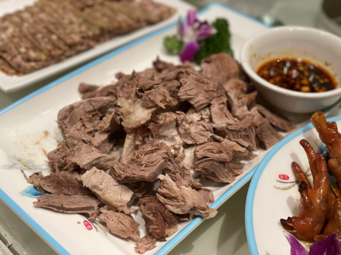 手撕哈拉巴,这名字是不是一下就看蒙了?哈拉巴是满语,是猪背脊前方到肩胛骨处的肉,是猪身上运动量较大的部位。这个部位的肉带筋又有油脂,口感特别好。新鲜的肉只需要最简单的烹饪方式,白水煮后手撕上桌,配着蒜泥酱油辣椒调的酱汁,就能把它的美味体现出来,入口满是肉香,原味滋味更足。