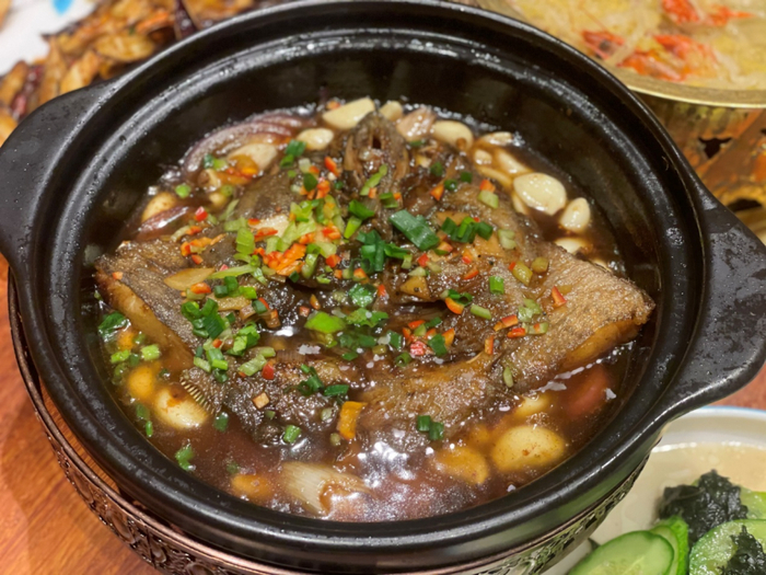 砂锅碟鱼头是招牌菜之一,肉质极其鲜嫩,口感特别好,用红烧的方式呈上,又是另一种风味。不同于烧烤那种外表焦酥的口感,但是味道也很鲜。