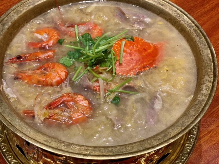 汆锅底是很有代表性的东北菜之一,是满族传统火锅在东北民间的延续,被称作满族火锅的简化版,但在海口的东北菜餐厅里是少见的菜品。它的食材有螃蟹、虾、东北酸菜、羊肉卷和粉条,炖成汤菜,汤底味道除了酸菜的酸香还有海鲜和羊肉一起煮过的鲜味。