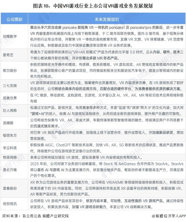各上市公司根据行业及自身的发展制定了业务发展规划,其中包括VR游戏及终端新产品的研发和推出、游戏与AI的结合以及VR游戏生态的布局。各企业具体规划如下表所示: