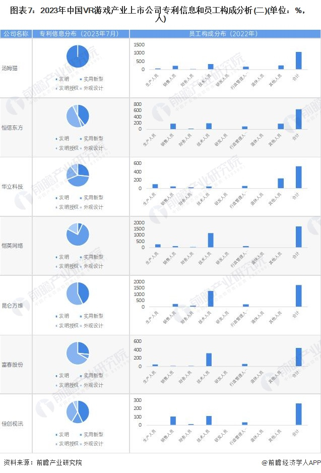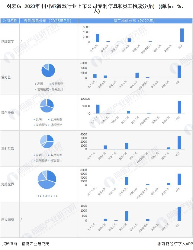 从VR游戏行业的上市企业已有的公开信息分析,专利信息相对较多的企业是格尔股份,其中发明专利2426条;此外,格尔股份员工总数也是最多的,员工总数为8.5万人,其中研发人员占比14.42%。