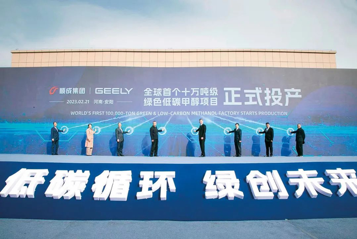 2023年2月21日,吉利与河南顺成集团在安阳投资建设的全球首个十万吨级二氧化碳和氢气一步制备甲醇项目投产仪式。图/吉利远程新能源商用车集团
