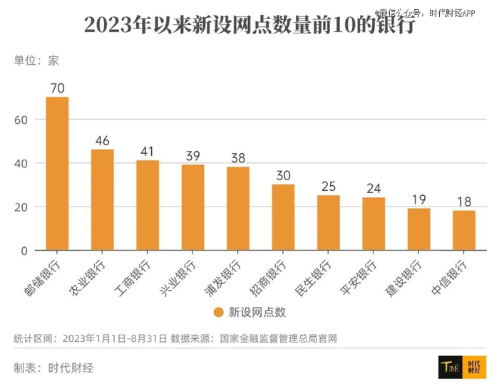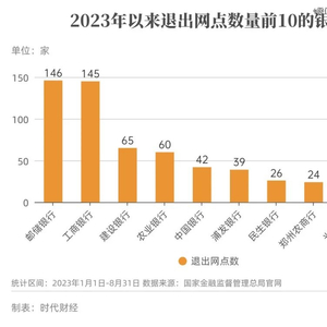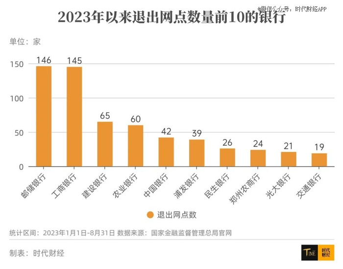 时代财经根据国家金融监督管理总局官网披露的数据统计得出,2023年以来(截至8月31日),邮储银行与工商银行撤点最多,分别为146家和145家;其次则是建设银行、农业银行,分别为65家与60家。