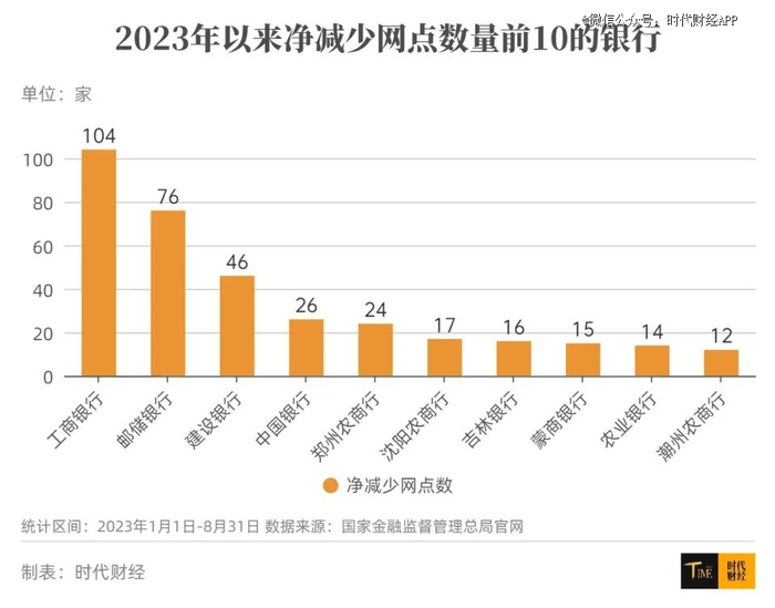根据时代财经统计数据,2023年以来(截至8月31日),工商银行净减少网点数量达到104家,其次是邮储银行、建设银行、中国银行,分别净减少76、46、26家。
