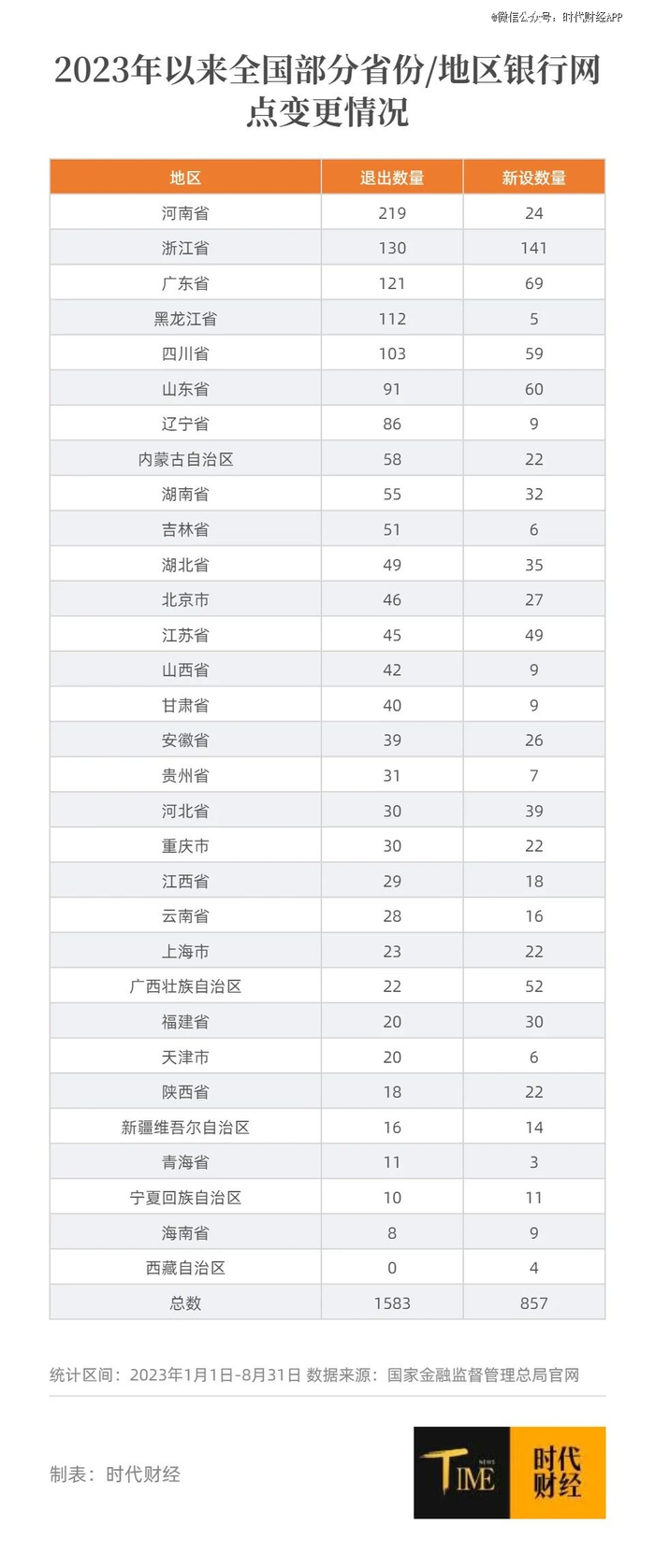 根据国家金融监督管理总局官网披露的数据,时代财经对2023年以来(截至8月31日)退出的银行网点(包括支行、分理处、服务点、储蓄所、营业所,不包括村镇银行与信用社)进行了相关统计。