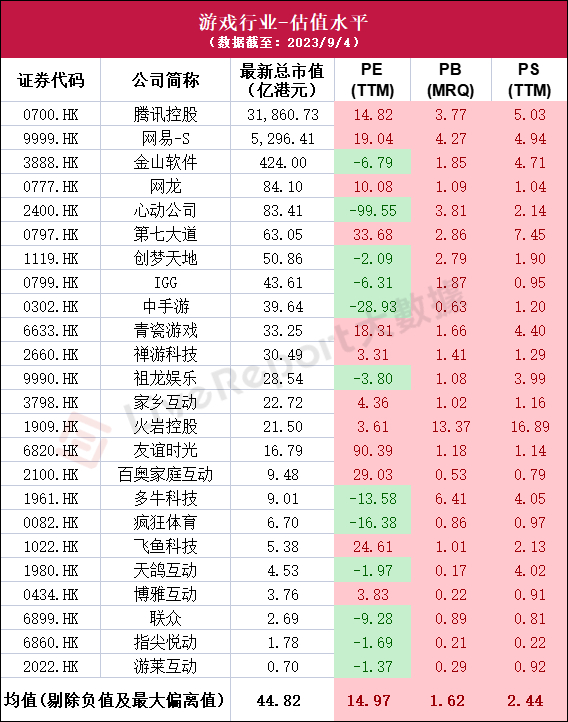 截至2023年9月4日,在剔除市值过大的腾讯后,港股游戏行业的平均市值约为44.82亿港元,常规三项估值指标PE/PB/PS的均值分别约为14.97倍、1.62倍、2.44倍。