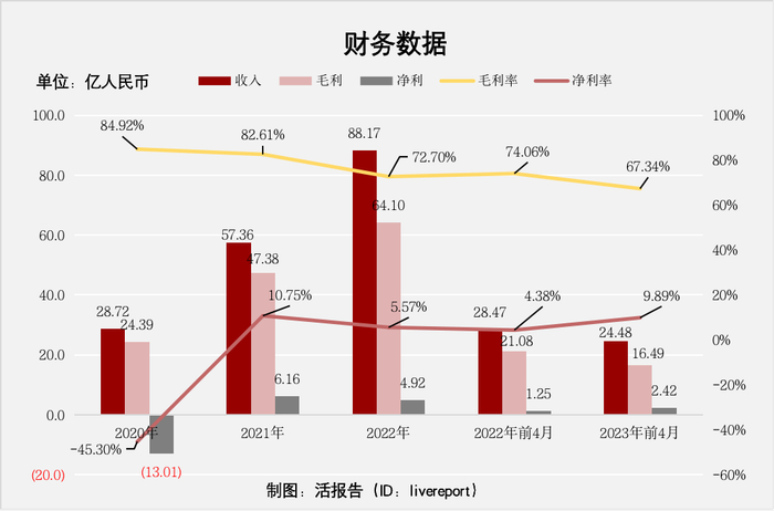 2022年收入为88.17亿元人民币(年复合增长率为75.20%),净利润4.92亿元人民币,毛利率72.70%,2023年前4个月收入24.48亿元,净利润2.42亿元。