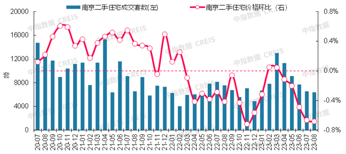 图:2020年7月至2023年8月南京二手住宅成交套数及二手住宅价格环比走势