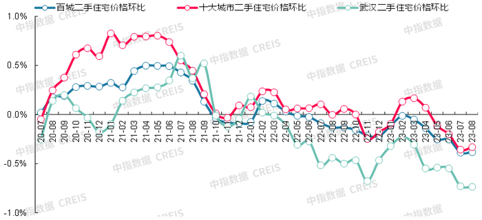 图:2020年7月至2023年8月百城、十大城市及武汉二手住宅价格环比走势对比