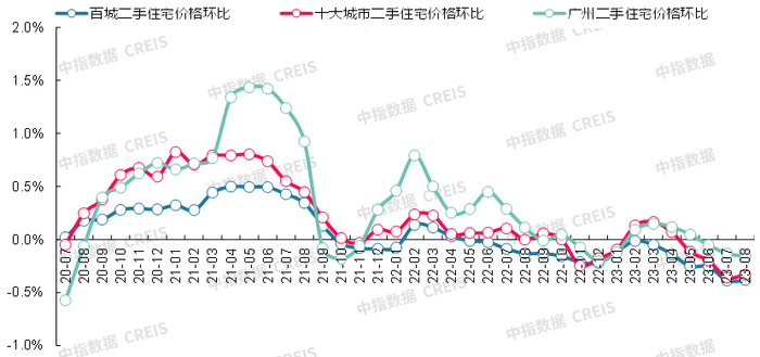 图:2020年7月至2023年8月百城、十大城市及广州二手住宅价格环比走势对比