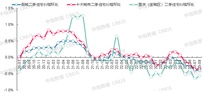 图:2020年7月至2023年8月百城、十大城市及重庆二手住宅价格环比走势对比