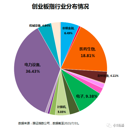 截至2023年7月31日,创业板指中权重占比最高的三大申万一级行业分别为电力设备、医药生物和电子,权重占比分别为36.43%、18.81%和9.38%,三者合计超过60%,行业集中度较高。