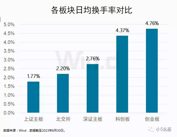 另一方面,2023年上半年创业板的日均换手率为4.76%,高于沪深主板、科创板的同期平均换手率。