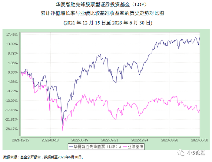 上图则是其运用AI深度学习选股的全市场股票型产品华夏智胜先锋。截至2023年6月30日,产品自2021年底成立以来的累计净值增长率为16.34%,超越同期业绩比较基准为33.48%(业绩比较基准:中证500指数收益率*95%+银行活期存款利率(税后)*5%),不仅在几乎全年下跌的2022年仅微跌-0.71%,更是在震荡的2023年上半年取得了15.05%的正收益率,在过去一年中排名同类产品的前4%(具体排名为13/317,排名数据源自银河证券,同类为标准股票型基金(A类),数据截至2023/6/30)。
