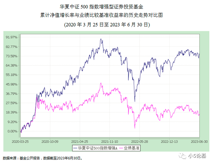 上图是其代表性指数增强产品华夏中证500指数增强。截至2023年6月30日,产品自成立以来的累计净值增长率为76.45%,超越同期业绩比较基准高达59.31%(业绩比较基准:中证500指数收益率*95%+银行活期存款利率(税后)*5%),长期超额收益极为明显。同时,其近1年和近3年的收益率分别排名同类产品的第一(1/132)和第一(1/91)(排名数据源自银河证券,同类为增强规模指数股票型基金(A类),数据截至2023/6/30)。