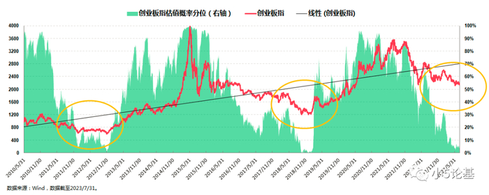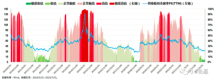 从估值的角度来看,截至2023年7月31日,创业板指的市盈率(PE TTM)为32.12倍,相对估值分位为4.53%(数据区间为2010/5/31~2023/7/31),估值下杀的空间小、修复概率大,也因此当前创业板指数具备较高的投资性价比。