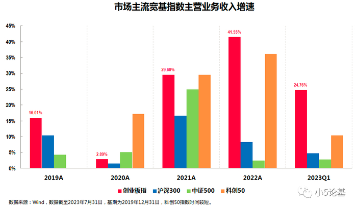 同时,创业板指数2023年一季度主营业务收入增速为24.76%,高于科创50,具有较高的成长性。
