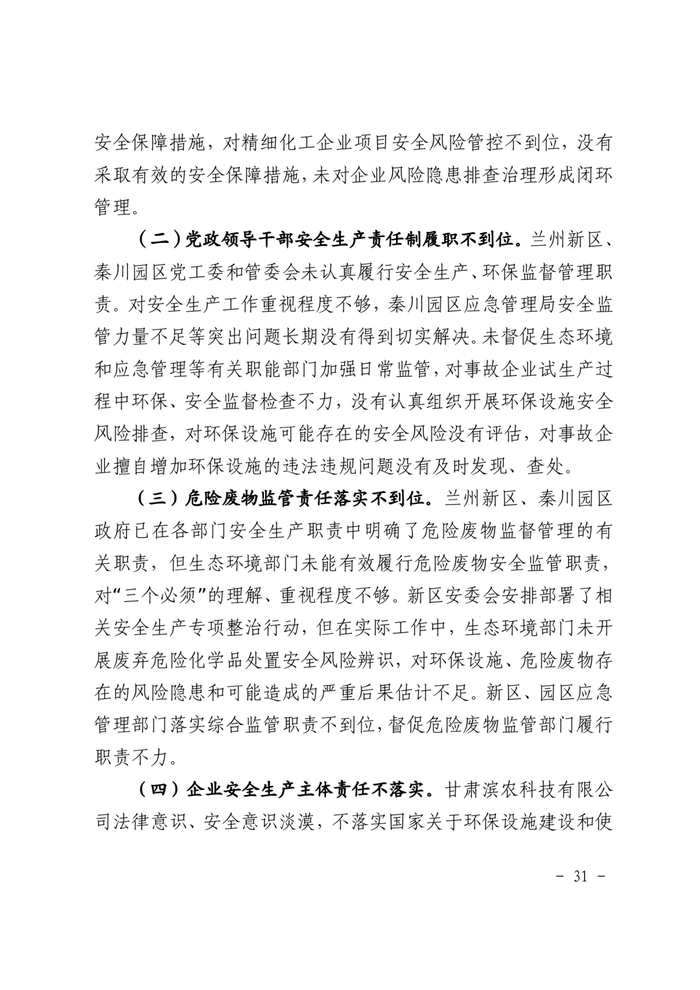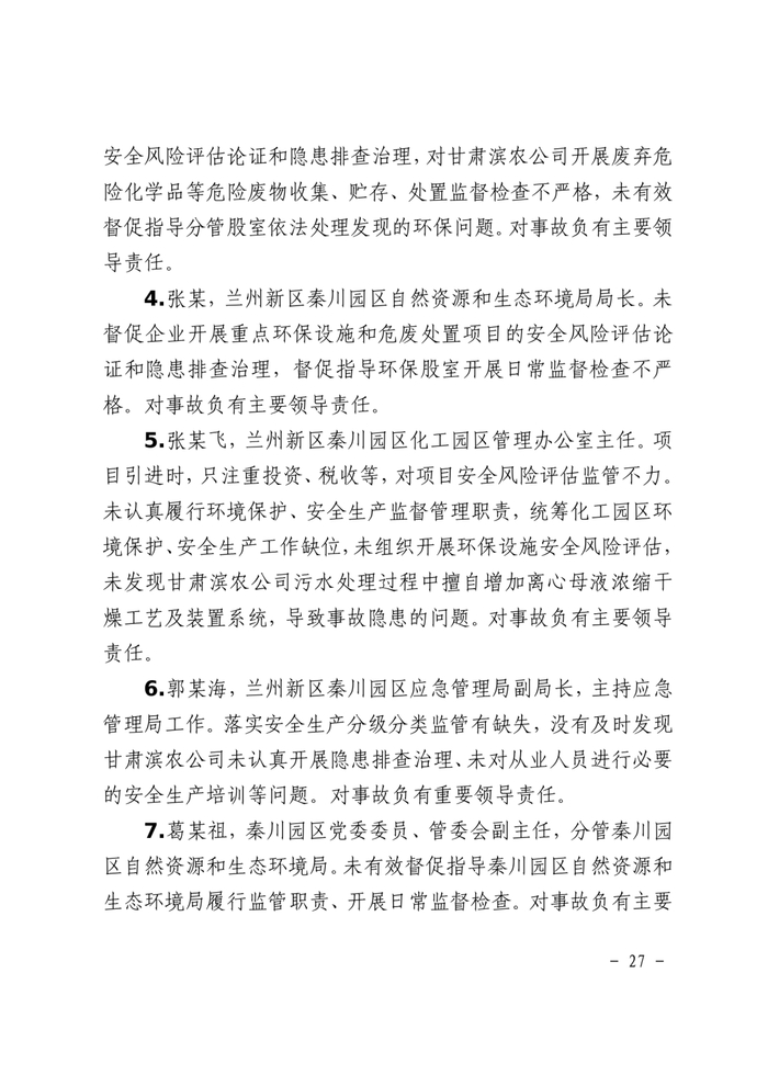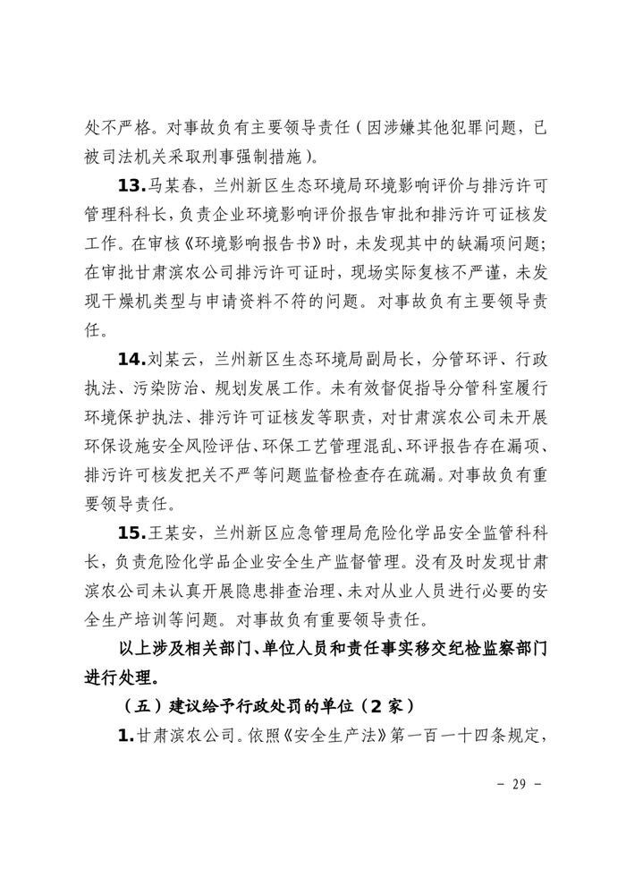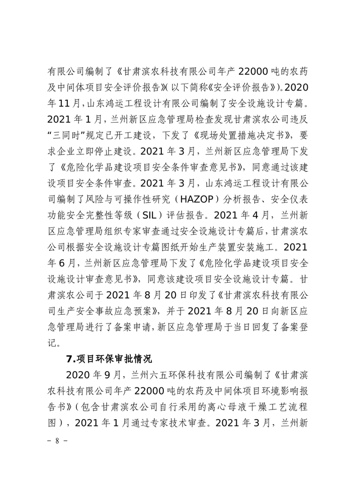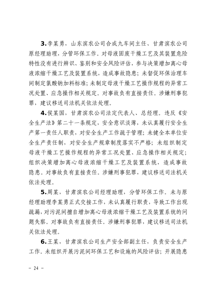 事故调查报告显示,甘肃滨农科技公司总经理、环保治理部主任和生产安全部副主任等8人因对事故负有直接责任,涉嫌刑事犯罪,建议被移送司法机关处理。