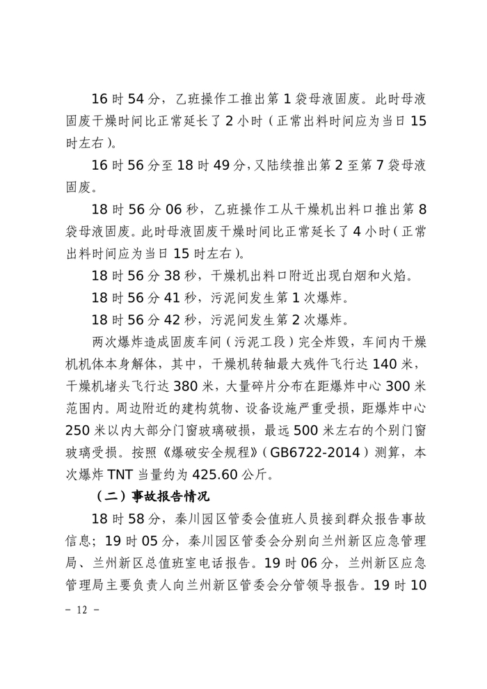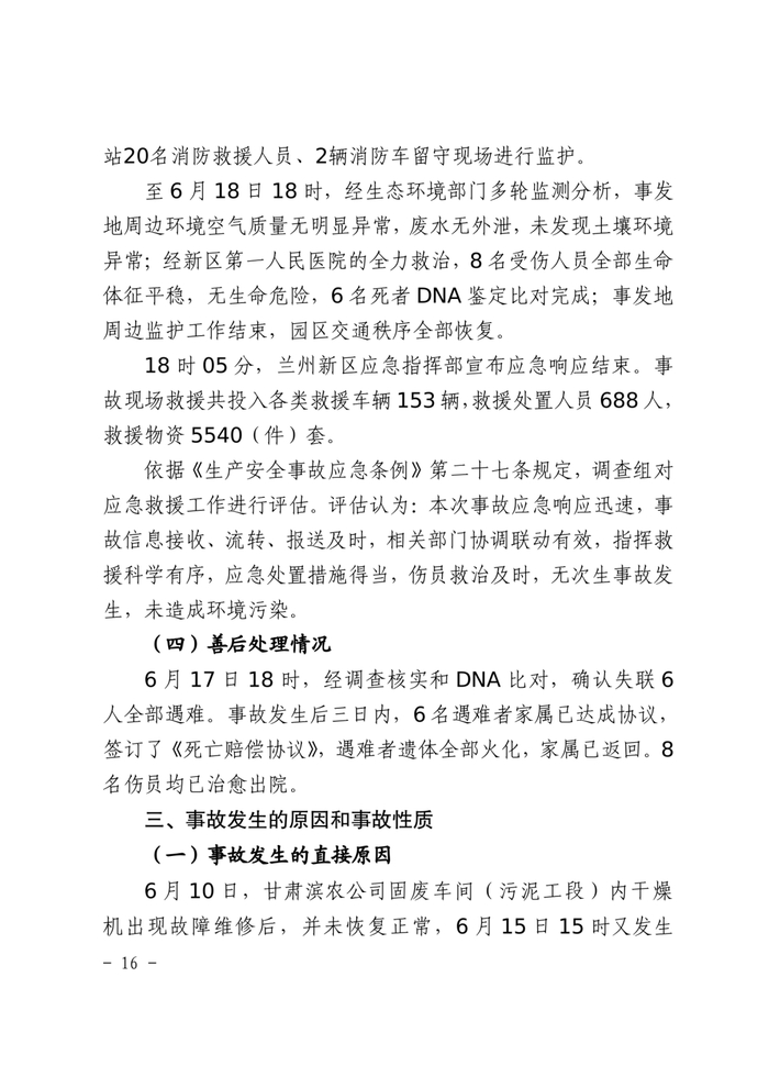 2022年6月16日,甘肃兰州新区秦川园区甘肃滨农科技公司固体废料处理车间(污泥处理工段)发生爆炸事故,造成6人死亡、8人受伤,直接经济损失4190.45万元。