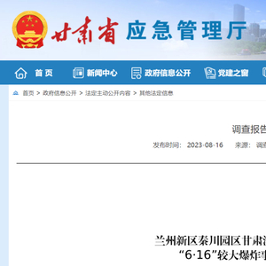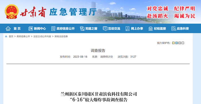 近日,甘肃省应急管理厅公布了《兰州新区秦川园区甘肃滨农科技有限公司“6·16”较大爆炸事故调查报告》。