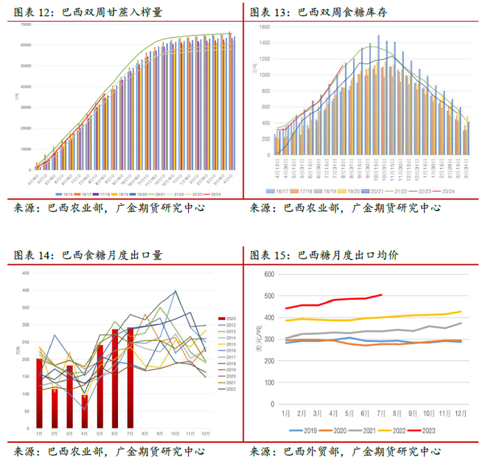 (1)预计新榨季23/24榨季产量下滑,消费上涨,全球食糖供需缺口为212万吨。具体而言:2023/24榨季全球产糖量预计为1.7484亿吨,低于2022/23榨季的1.7702亿吨;消费量预计仅增加0.3%,至1.7696亿吨。这是ISO对新榨季食糖市场状况的首次预估,ISO表示,缺口预期主要是由于全球食糖主产国巴西的产量可能下滑。价格上涨和部分地区产品准入受限正在降低消费预期。