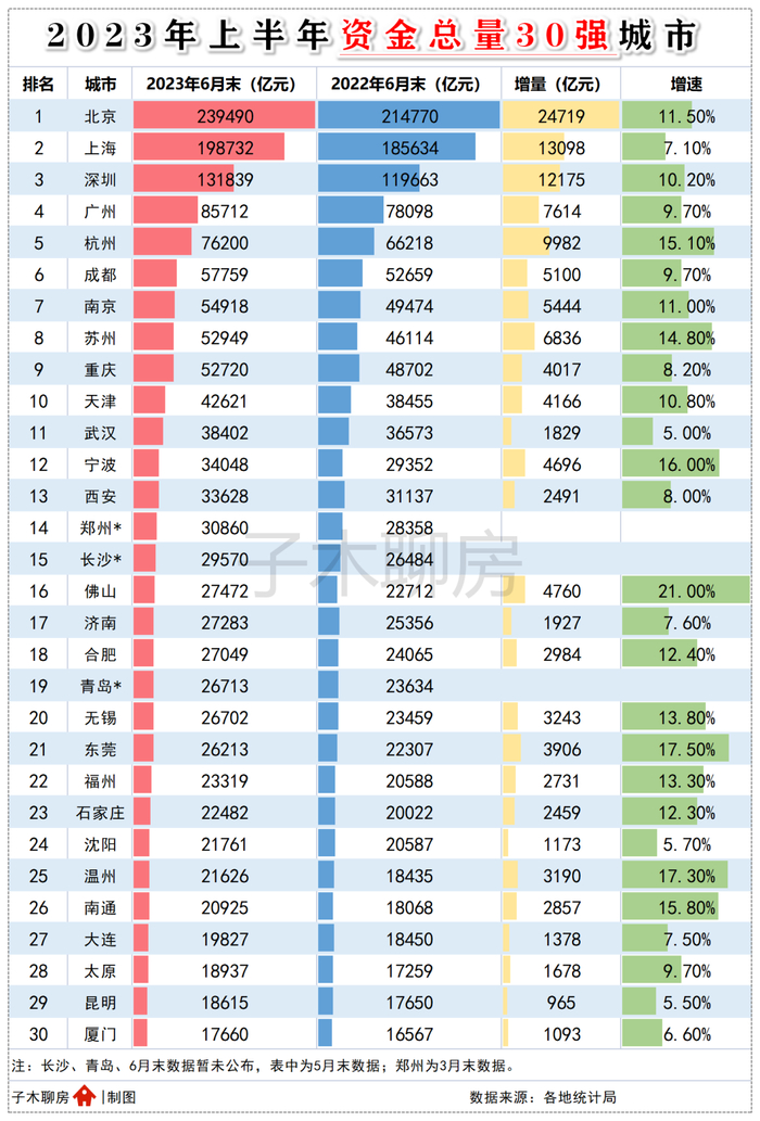 按照资金总量(金融机构本外币存款余额)来讲,2023年上半年,北京近24万亿,上海近20万亿,深圳13万亿,广州8.5万亿。