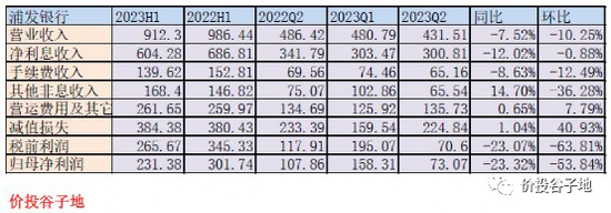 根据2023年中报,浦发银行营收912.3亿,同比下降7.52%。净利息收入604.28亿,同比下降12.02%。非利息收入中手续费收入139.62亿同比下降8.63%。归母净利润231.38亿同比下降23.32%。更多的数据如下表1所示: