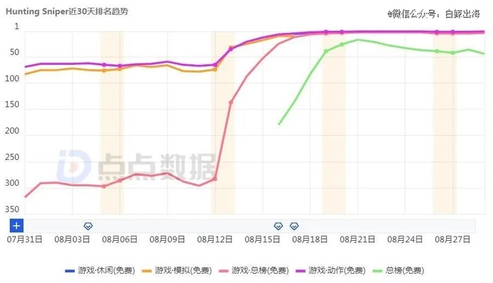 但最近一款名为「Hunting Sniper」的产品从 8 月 12 日开始迅速爬榜。这款仅推出 iOS 版本的游戏,在 8 月 18 日拿下了美国 iOS 手游下载榜 Top 5(点点数据),截止到 29 日依然稳定维持在 Top 5,总榜前 100。可以说是打猎题材手游里近年来都颇为罕见的小胜利。